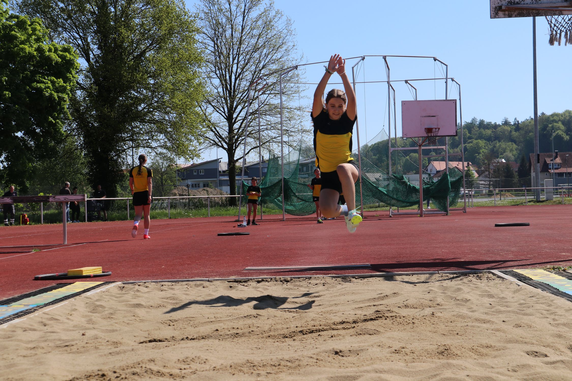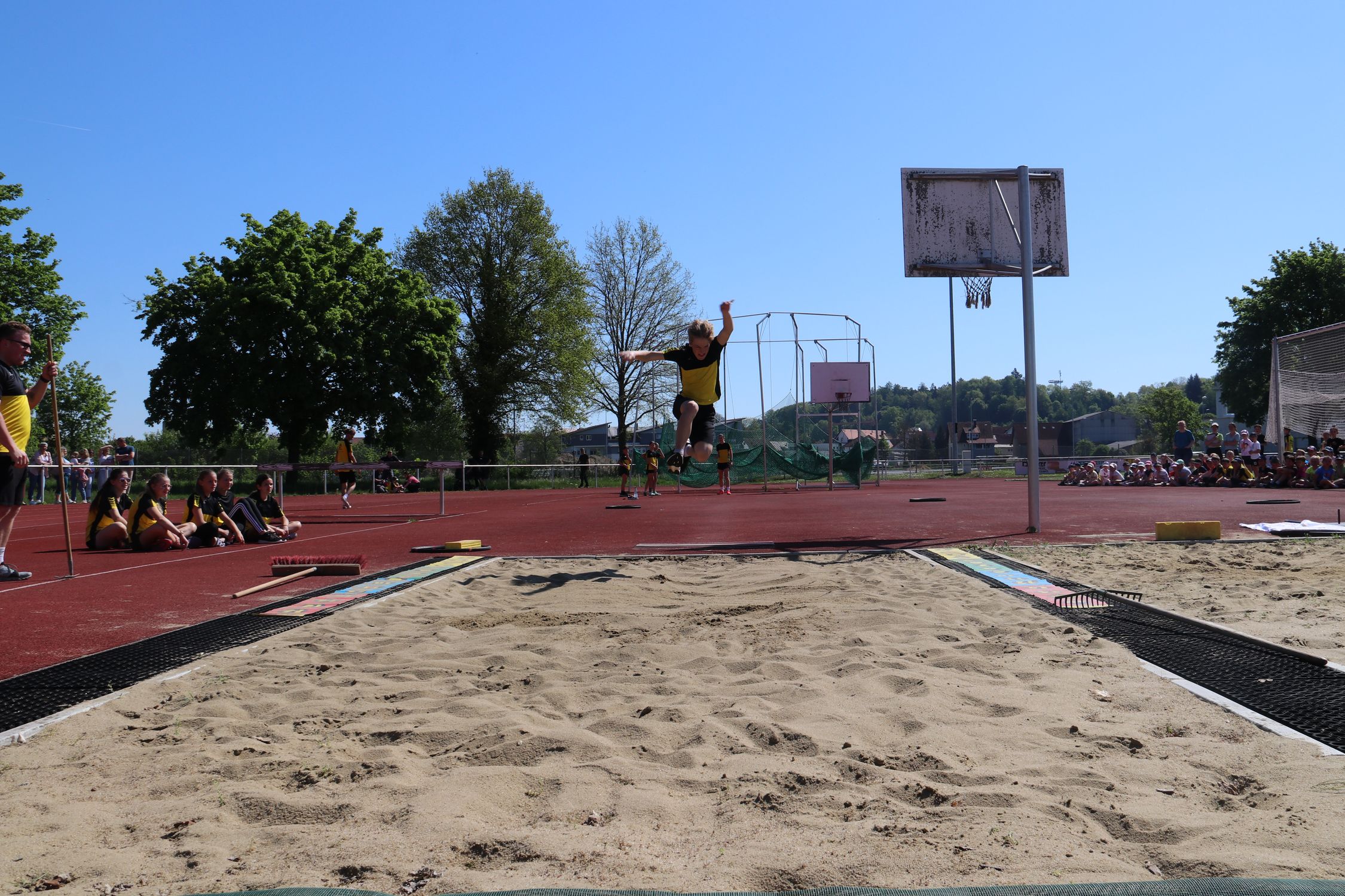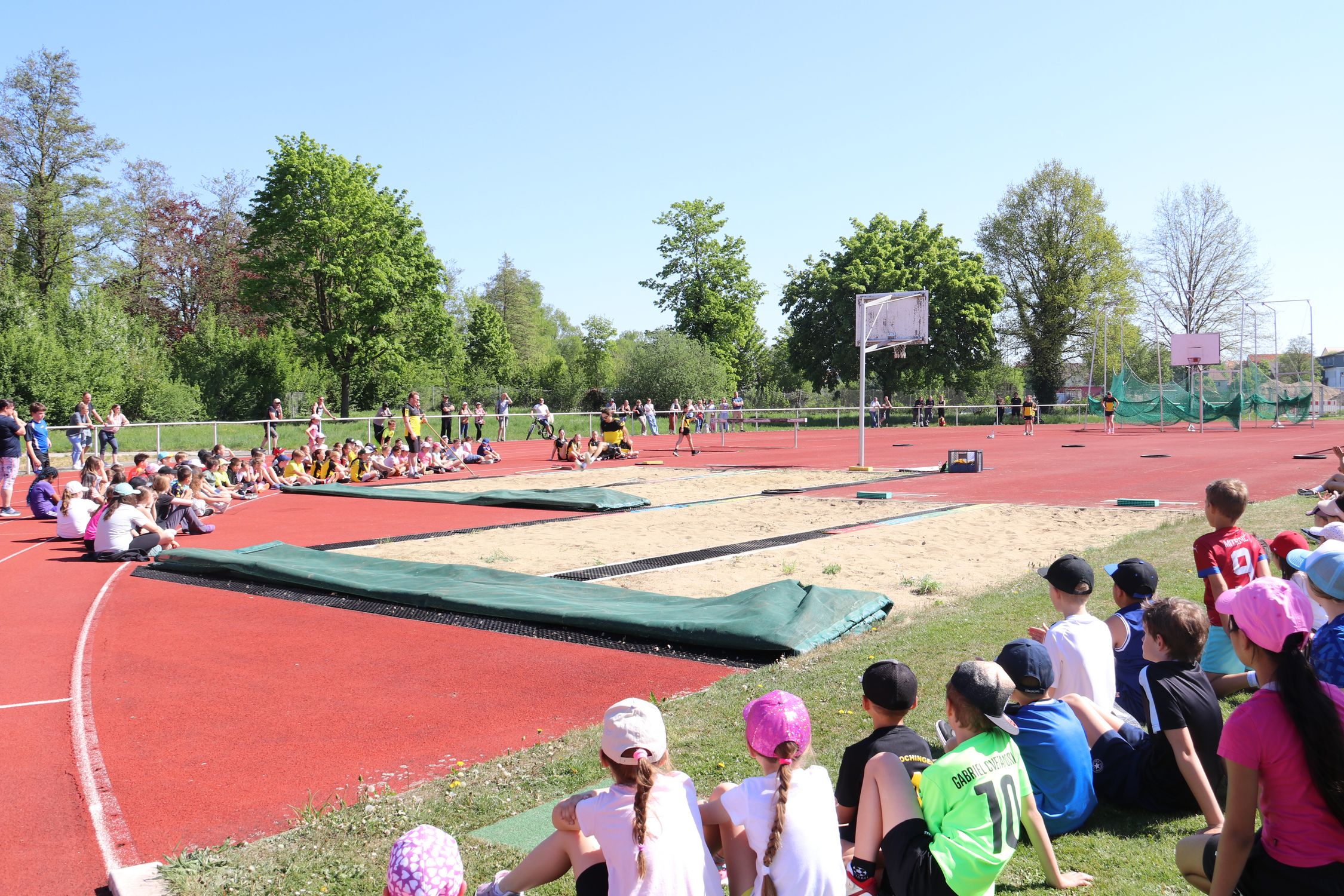 Bei strahlendem Sonnenschein wurde eine nach der anderen Station von den 13 Klassen durchlaufen und nicht nur einmal bekamen die Lehrkräfte, die Helfer:innen und das WLV-Team von den Kindern zu hören, dass die Stationen richtig viel Spaß machen. Ein besonderes Highlight für alle war die Weitsprung-Vorführung des TV Mengen. Athlet:innen von der U12 bis zur U20 sprangen um die Wette und wurden dabei lautstark von den Grundschulkindern angefeuert.