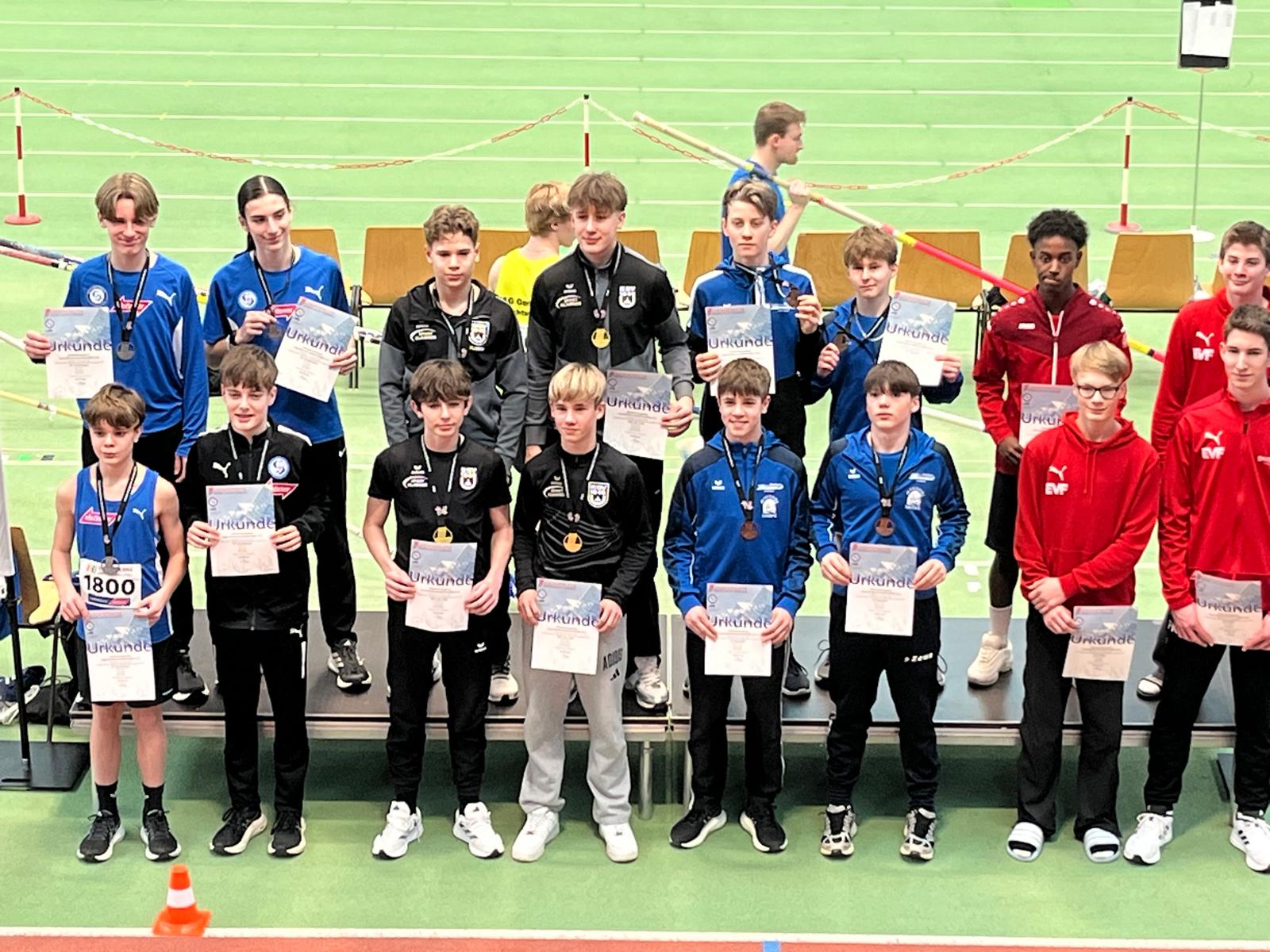 Tags zuvor in Ulm hatte sich Drayton in der W15 schon drei Mal Gold gesichert: Nach Siegen über 60 m in 8,02 und 60 m Hürden in 9,36 Sekunden freute sie sich besonders über den Weitsprungsieg mit neuer Bestleistung von 5,43 m. Über die Hürden gingen auch die Goldmedaillen der M15 und M14 an den SSV 46: Bei den älteren Jungs siegte Lukas Gallmeier mit 8,80 hauchdünn vor Konrad Wäsler mit 8,82 Sekunden. Silber und Bronze holten sich die beiden in der gleichen Reihenfolge mit tollen neuen Bestleistungen im Weitsprung: 5,97 m für Gallmeier und 5,95 m für Wäsler. Im jüngeren Jahrgang rettete Johannes Stahlhut mit 9,55 über die Hürden eine Hundertstel Vorsprung ins Ziel. Dritter wurde hier sein Vereinskamerad Mate Varvodic in 9,72 Sekunden. Über 800 m ersprintete sich Matteo Groth (Tomerdinger LV) in der M14 den Sieg in 2:15,06 Minuten. Silber gab es für seine Vereinskameradin Anna Ohmayer in 2:23,62 Minuten.